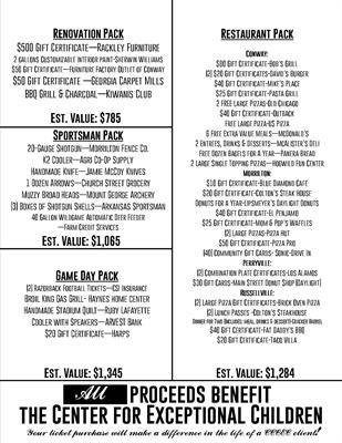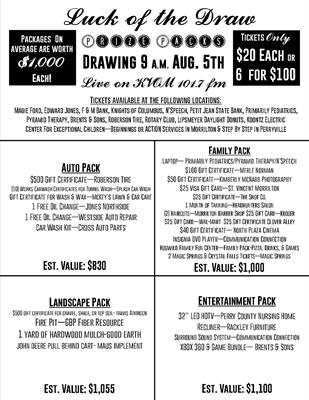 Eight different themed “Prize Packs” (each worth $1,000 on average) will be raffled off, and we want you to have a chance to win!  Tickets are only $20 each or 6 for $100 and as a unique feature, LOTD will allow you the option to select in which prize pack your ticket or tickets will be entered.  This aspect will ensure you have a chance to win only the prizes that appeal to you. Doesn’t that sound exciting?!   Choose from the Auto Pack, Family Pack, Entertainment Pack, Landscape Pack, Game Day Pack, Restaurant Pack, Sportsman Pack or Renovation Pack.            A full list of items in each pack can be found on the Center’s website (www.centerforexceptionalchildren.org) or Facebook Page (www.facebook.com/cccec).   Tickets will be available thru August 1st at the Center or any of our Luck of the Draw sponsor locations.  Sponsors include:   Edward Jones Investments, Magie Ford, Farmers & Merchants Bank, Knights of Columbus, Koontz Electric, Petit Jean State Bank, Brents & Sons Heat & Air, Primarily Pediatrics, Pyramid Therapy, N’Speech, Roberson Tire, Morrilton Rotary Club or Lipsmeyer’s Daylight Donuts.